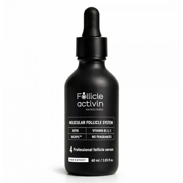 Mūsų FOLLICLE ACTIVIN serumą sukūrė ekspertų komanda, kurios tikslas buvo sumažinti plaukų slinkimą, įgimtą retėjimą ir suaktyvinti folikulų veiklą, kad plaukai augtų greičiau. Šis serumas sukurtas naudojant specialią technologiją, kuri padeda atkurti plaukų folikulų veiklą. Serumas veikia tiesiogiai aprūpindamas galvos odą bei plaukus gyvybiškai svarbiomis maistinėmis medžiagomis.
